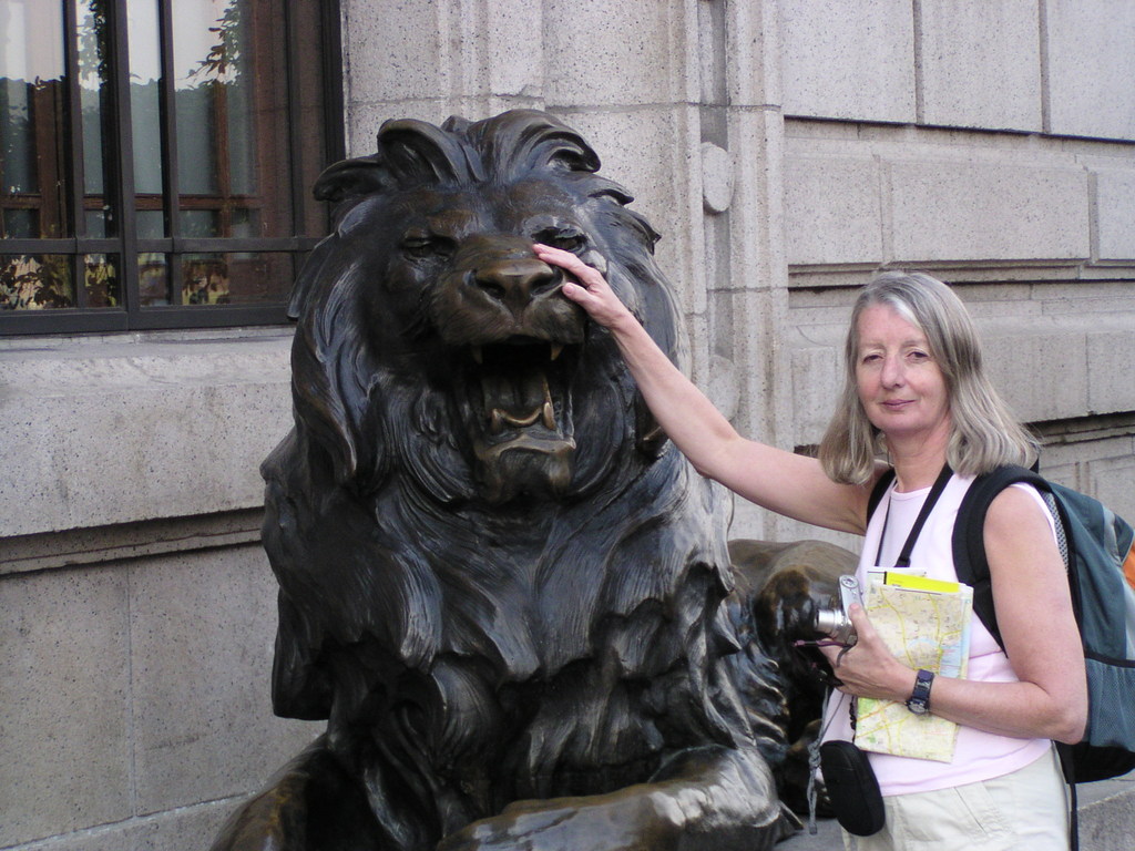 Margaret and a lion outside the Hong Kong and Shanghai Bank building pa231747 |